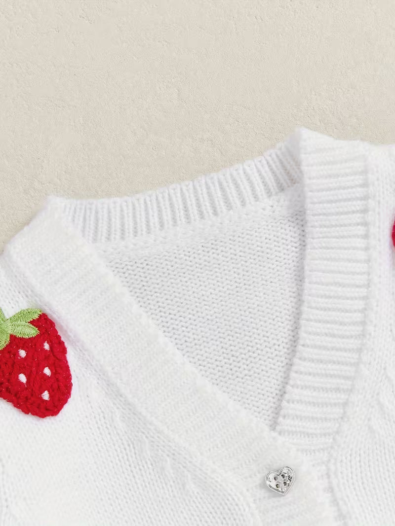 Introducing the Baby Girls Crochet Strawberry Cardigan Sweater—a delightful and charming addition to your little one's wardrobe that perfectly blends style, comfort, and warmth.