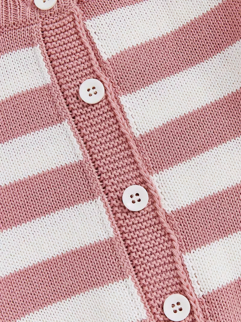 This enchanting cardigan features a charming blend of soft pink and white stripes, designed to bring warmth and style to chilly days.